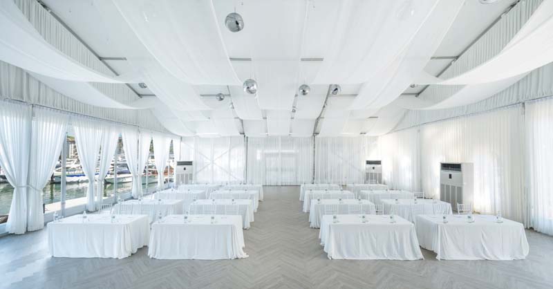Modern coastal mood with expansive marina outlooks for lunches, launches, and soirées.